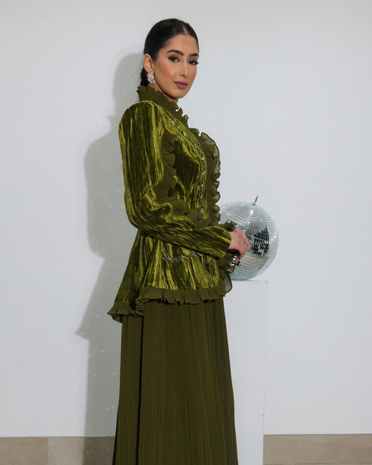 Velvet Olive Blazer with Pleated Long Dress